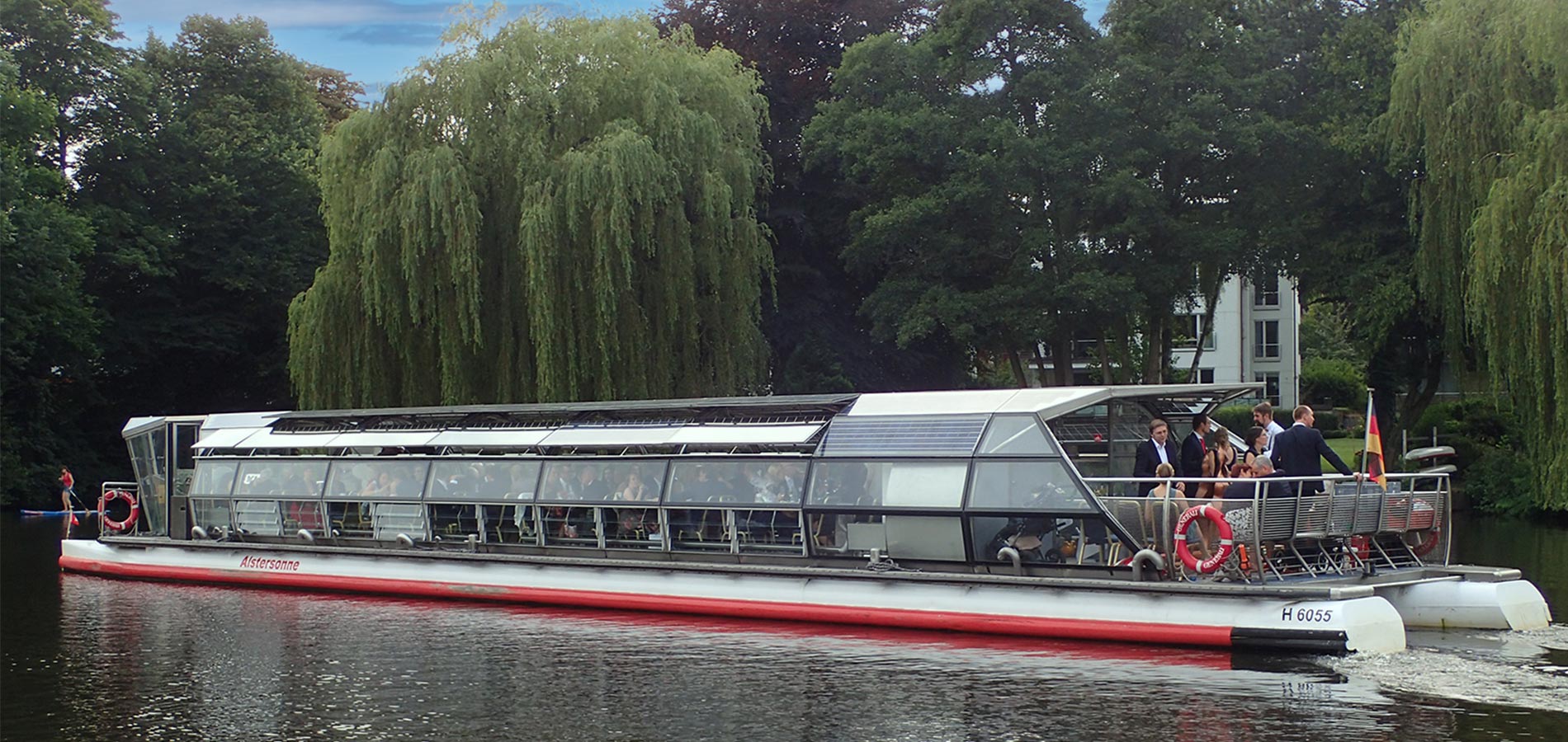 Give your event a unique ambience with an Alster cruise: whether a meeting, conference, Christmas party, birthday or wedding - the Alster-Touristik fleet with a total of 16 Alster ships of the types Traditionell, Flachschiff und Exklusiv bietet Ihnen eine breite Auswahl an schwimmenden Eventlocations. Nehmen Sie Ihr Team oder Ihre Gäste mit auf eine Fahrt entlang der Kanäle – von der Außenalster über Uhlenhorst, Harvestehude und Barmbek bis hinaus nach Alsterdorf. Oder schippern Sie gen Süden durch die Fleete der Speicherstadt.